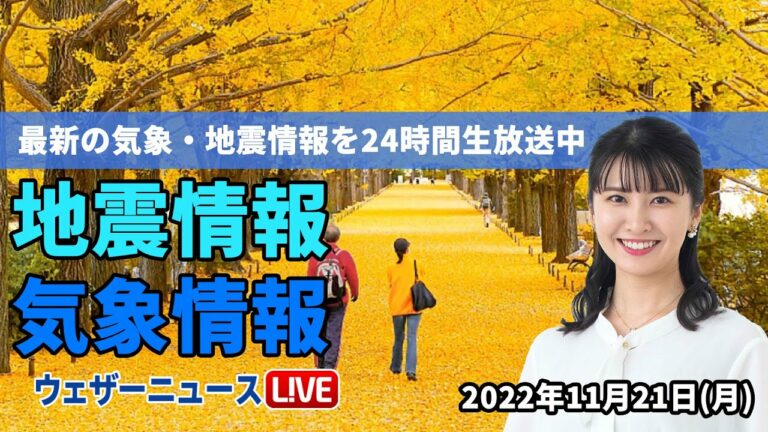 Home » 【LIVE】朝の最新気象ニュース・地震情報 2022年11月21日(月)/関東や東海は午前ほど雨〈ウェザーニュースLiVE〉