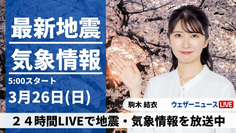 【LIVE】最新気象ニュース・地震情報 2023年3月26日(日) /ほぼ全国で本降りの冷たい雨〈ウェザーニュースLiVEモーニング〉