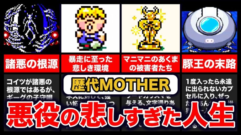 Share Facebook Twitter LinkedIn Pinterest Email 今回は、歴代MOTHERに登場した「悪役の悲しき裏設定」を解説。 何が正しくて何が悪いのかが、分からなくなりますね。 霊夢と魔理沙のゆっくりボイスで、MOTHER愛に溢れた企画を投稿していきます。※たまにシリーズのシンボル「どせいさん」がふらっと登場することも・・・ #mother2 #motherシリーズ #歴代mother mother ゲーム