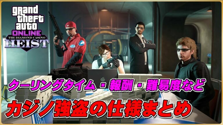 カジノ強盗のクーリングタイムや報酬額などについて解説しています。過去にも動画にしている内容ですが再度一つの動画にまとめ、最新の情報にアップデートした内容になっています。