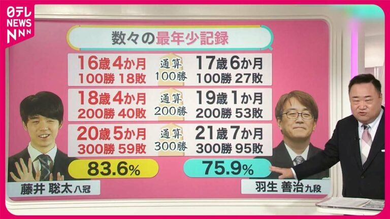 そこから16歳4か月で通算100勝に到達しました。これも羽生善治・九段の最年少記録を更新し、それまでの負け数も18敗と藤井八冠の方が少なかったのです。