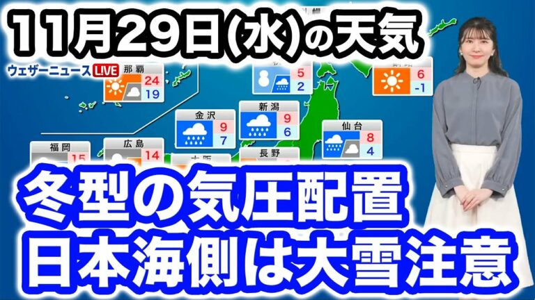 29日(水)は冬型の気圧配置となり、上空には寒気が流れ込みます。日本海側は雪や雨となり、北日本では大雪や吹雪に注意が必要です。太平洋側は日差しの届く所が多くなりますが、昼間も風が冷たく感じられそうです。