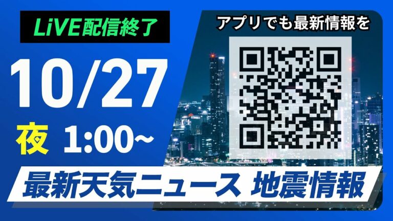 【ライブ】最新天気ニュース・地震情報 2024年10月27日(日)/前線停滞で雨や曇り<ウェザーニュースLiVE>