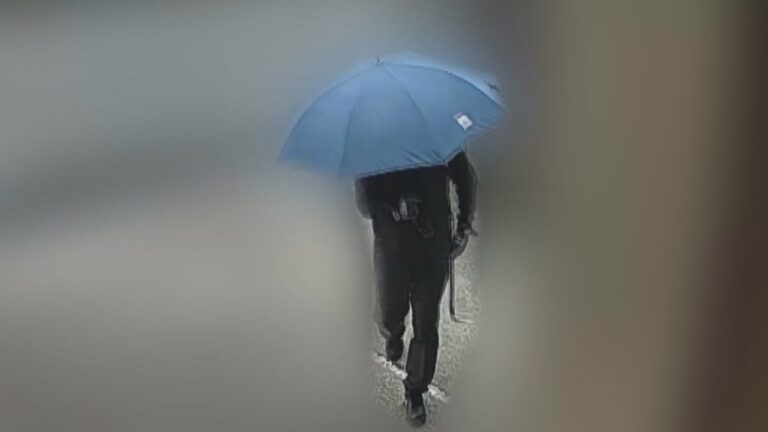 一旦通り過ぎて約30秒後にバックで戻ってきたと思いきや、再び画面から消えます。奇妙な動きをした車から降りてきたのは、顔を隠すためか「青い傘」をさしている人物。