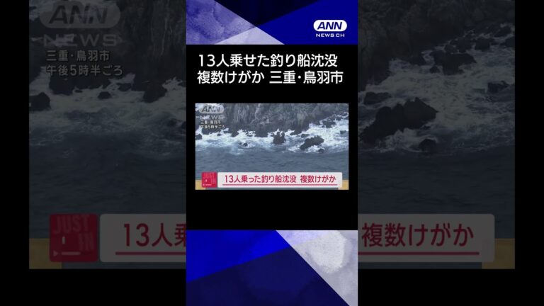 Share Facebook Twitter LinkedIn Pinterest Email 三重県鳥羽市で13人を乗せた釣り船が浅瀬に乗り上げ、沈没しました。複数人のけが人がいるとみられています。 3月15日午後2時半すぎ、鳥羽市小築海島付近で「遊漁船が乗り上げ、負傷者が多数いる」と118番通報がありました。 鳥羽海上保安部によりますと、事故があったのは遊漁船「第八大進丸」で、船が浅瀬に乗り上げ浸水し、沈没したということです。 船には当時、乗員乗客13人がいました。 複数の負傷者がいるとみられています。