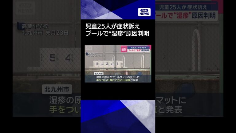 Share Facebook Twitter LinkedIn Pinterest Email 北九州市の小学校で先月、プールの授業後に児童25人が湿疹や腹痛を訴えた問題で、市は湿疹の原因がプールサイドのマットに手をついた際にできる圧迫痕だったと発表しました。 また、腹痛については手の症状との関連性はなく、個人の体調や体が冷えたことによるものと結論付けました。 水質調査で問題がなかった学校から順次、中止していたプールの授業を再開しています。