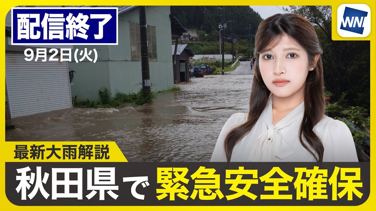 【ライブ配信終了】最新天気ニュース・地震情報 2025年9月2日(火)/東北は線状降水帯による大雨のおそれ 秋田県で緊急安全確保〈ウェザーニュースLiVEムーン・岡本 結子リサ/宇野沢 達也〉