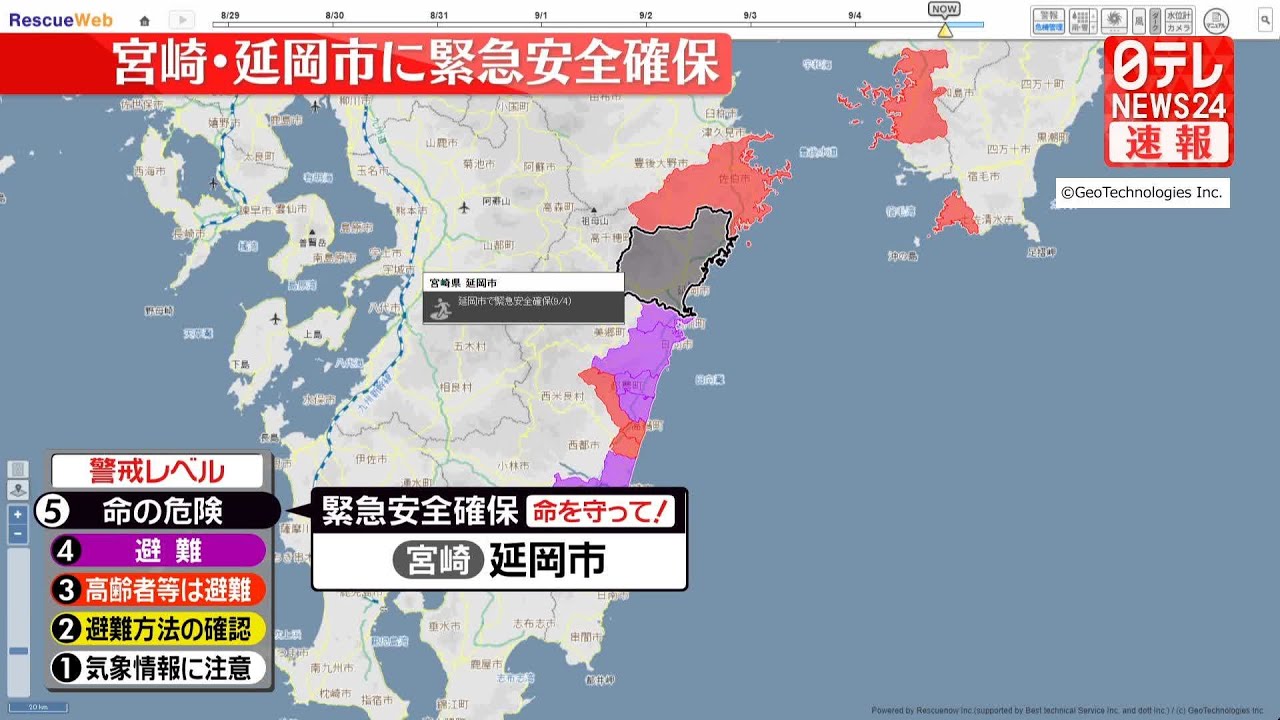 宮崎県延岡市に5段階の警戒レベルのうち、危険度が最も高い警戒レベル5の「緊急安全確保」が出されました。